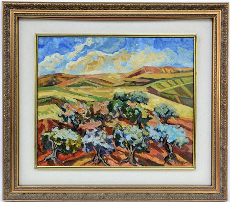 "Paesaggio" olio su tela (cm 50x60) Firmato in basso a destra. Firmato e titolato al retro. In cornice