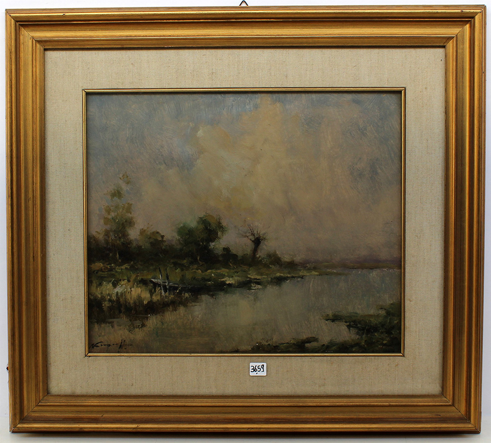 "Paesaggio lacustre" olio su compensato (cm 38,5x46) firmato in basso a sinistra. In cornice