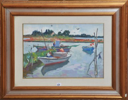 "Laguna di Grado" tecnica mista su cartone (cm 36x50) firmato in basso a destra. Titolato e firmato al retro, in cornice