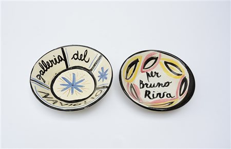 Manifattura ceramica di Albisola. Lotto di due piatti in terracotta smaltata in policromia sotto vetrina e graffiato. Uno con dedica "Per Bruno Riva" firmato e datato "CARDAZZO 1963" sotto la base, l'altro iscritto "Galleria del Naviglio", firmato e datato sotto la base "CARDAZZO 1957" (difetti e restauri)