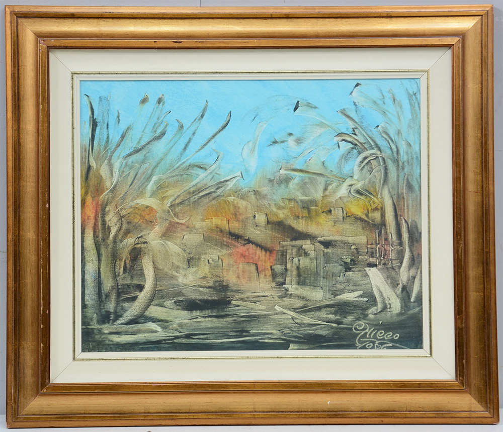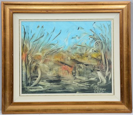 "Paesaggio" 1986, tecnica mista su tela (cm 40x50)firmato e datato in basso a destra. Firmato e datato al retro, in cornice