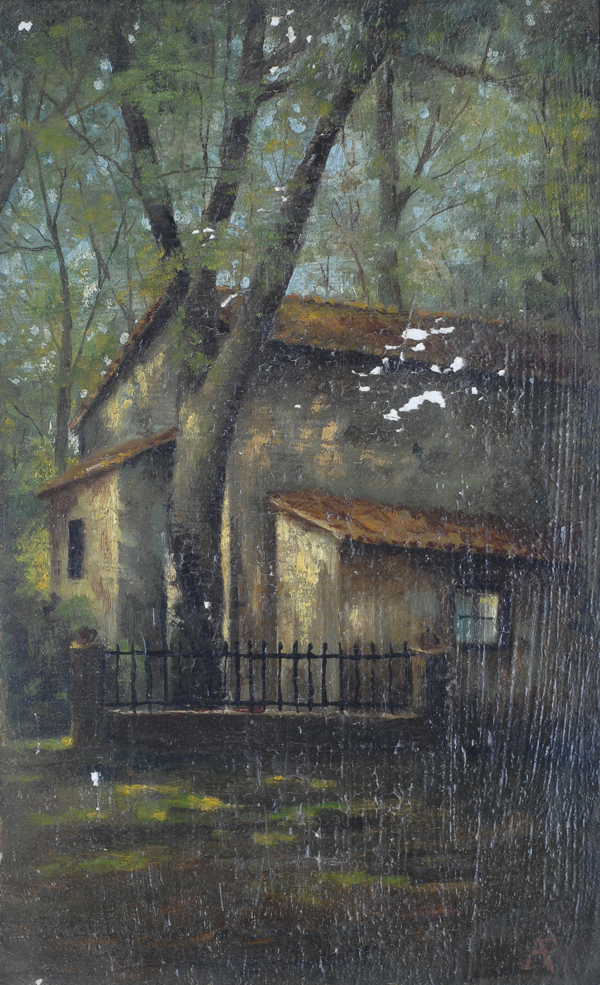 Anonimo del XX sec. Casolare Olio su cartone, cm. 30,5x19,3 Siglato in basso a destra. € 0/0