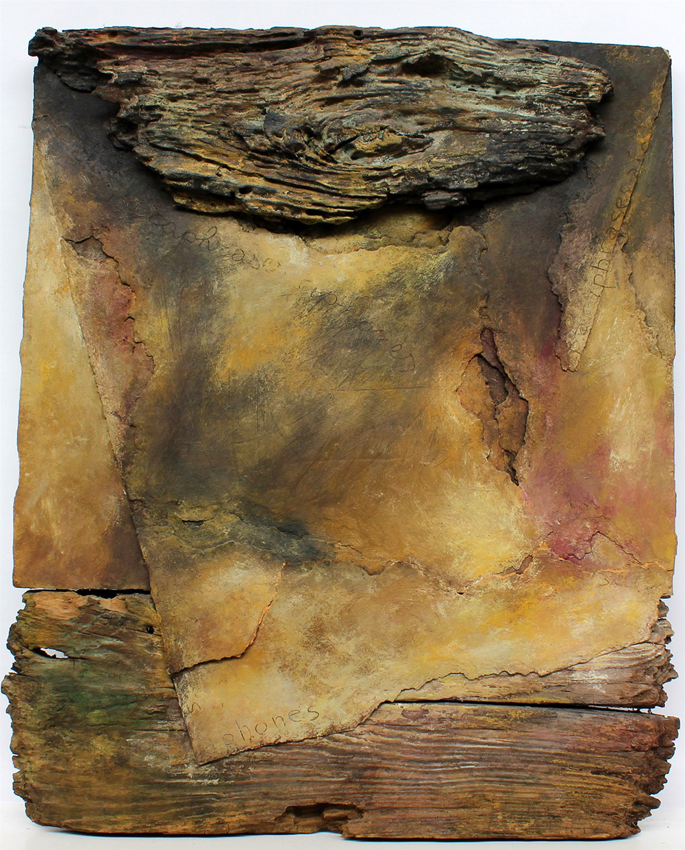 "Paraphrase aphones" 1990, tecnica mista, olio su cartone e tela ed inserti lignei (cm 88x70) titolato al fronte. Firmato, datato, titolato e iscritto al retro (difetti)