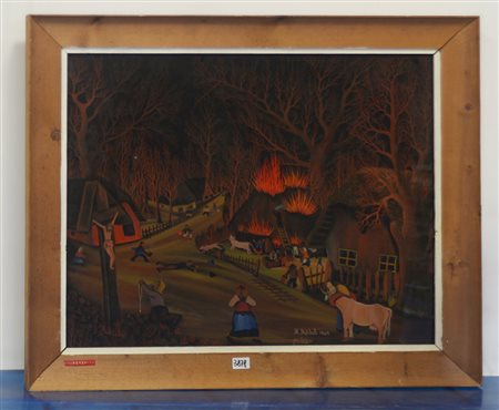 "Incendio nel villaggio" 1969 olio su vetro (cm 50x60) firmato, datato e iscritto in basso a destra in cornice(difetti). Timbro al retro della Galleria d’Arte antica e moderna, Riccione e timbro "Centro culturale e Naifs Jugoslavi, Milano".