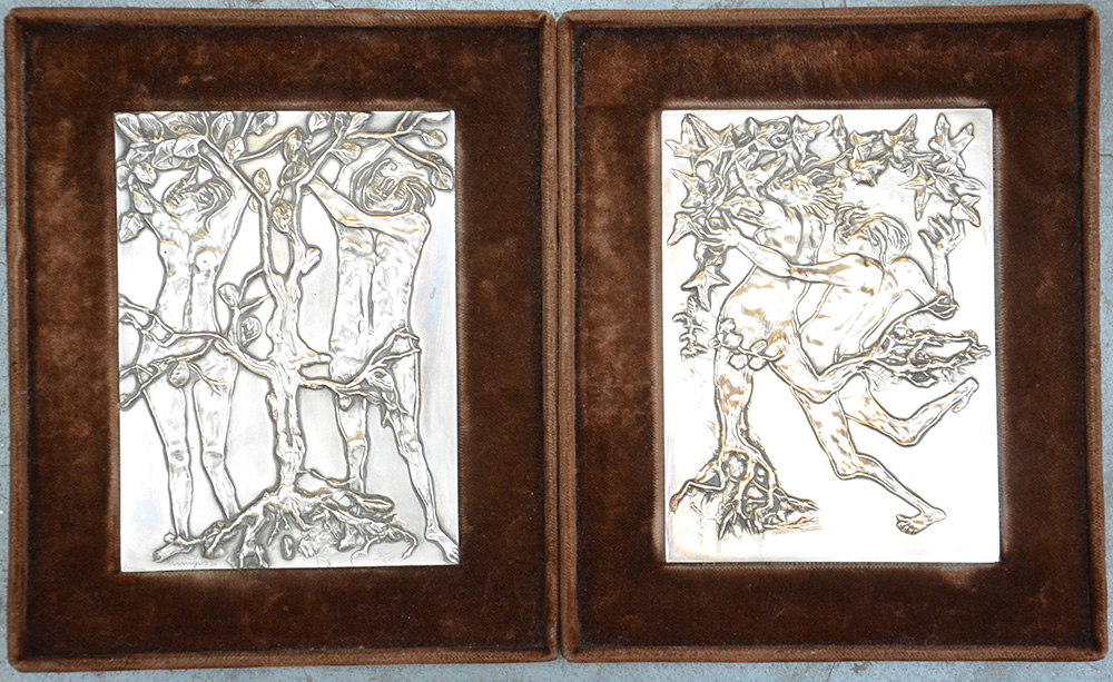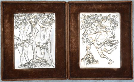 "Adamo ed Eva" due altorilievi in lastra d'argento(cm 15x11) in cornici di velluto, firmati e numerati in lastra, edizione di 500 esemplari (lievi difetti)