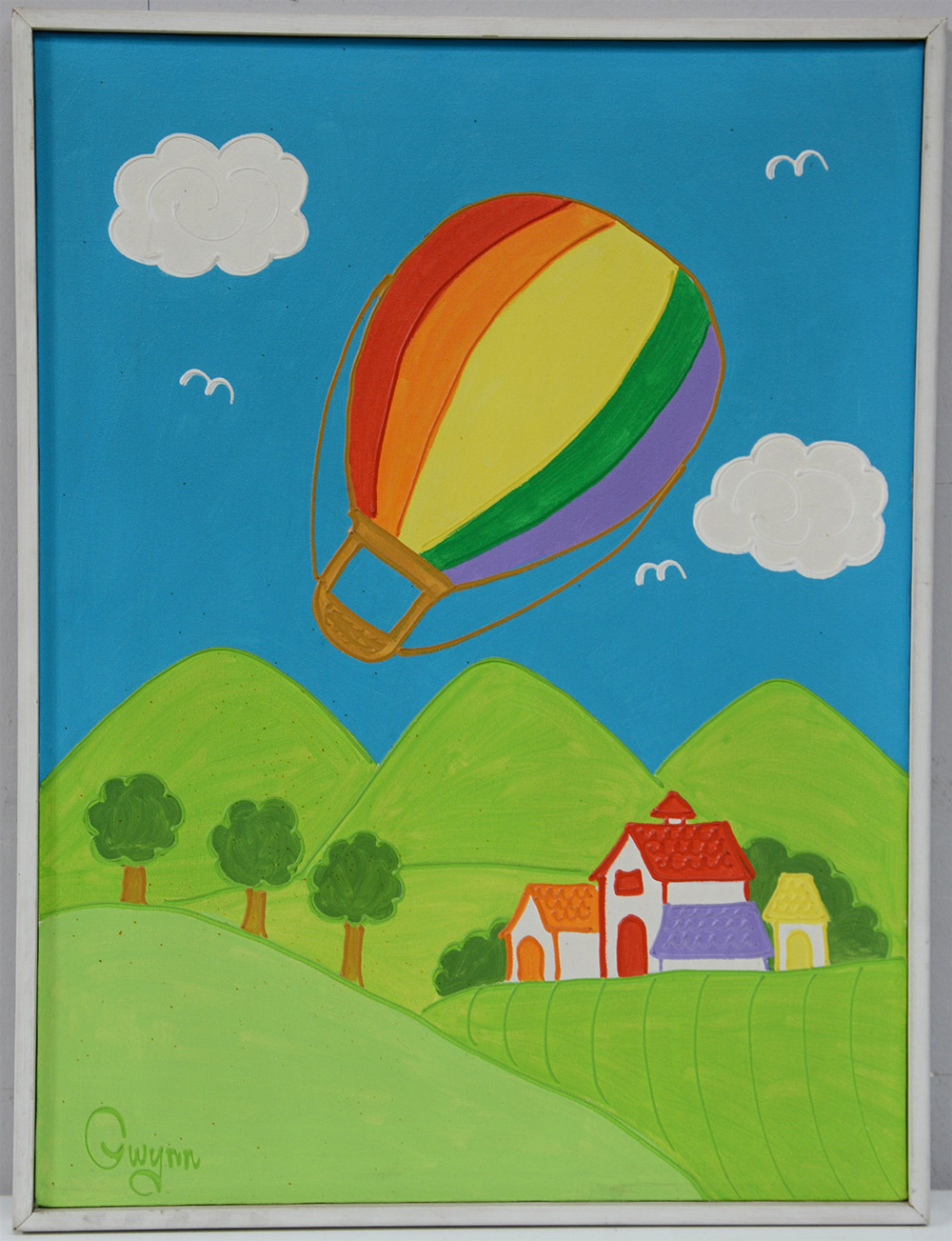 Gwynn. "Mongolfiera" acrilico su tela (cm 60,5x46) firmato in basso a...