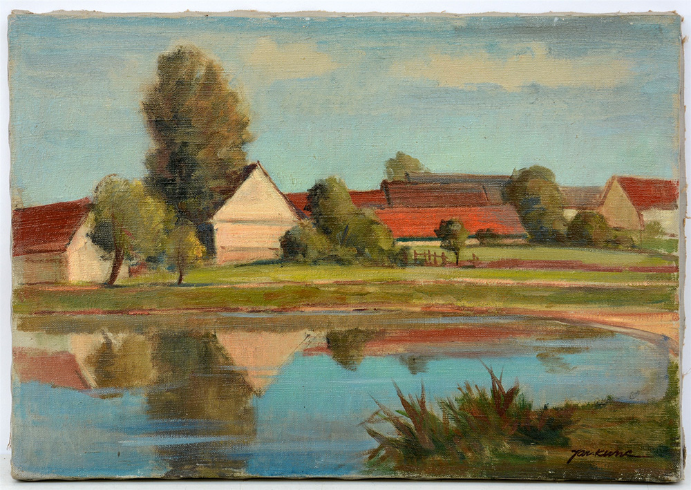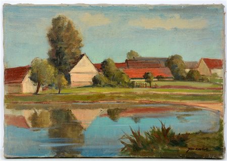Jaromir Kunc (Humpolee 0)"Paesaggio con lago" olio su tela (cm 35x50,5)...