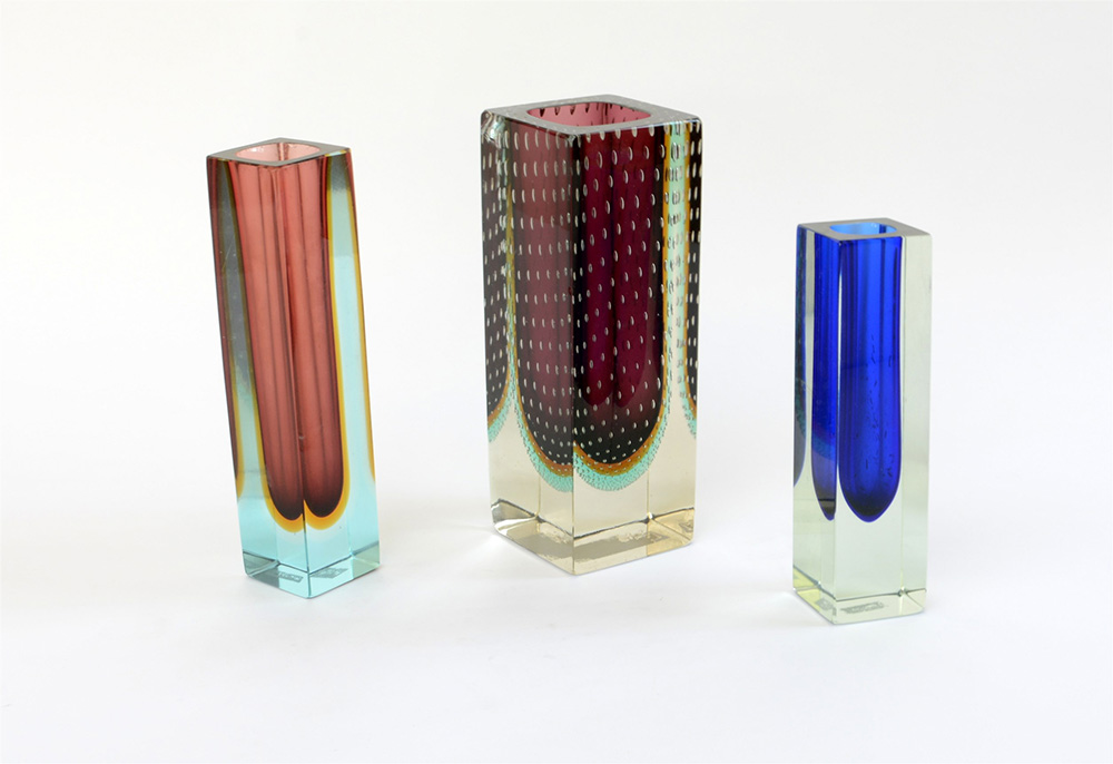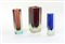 Lotto di tre vasi prismatici in vetro sommerso di diversi colori. Anni '60/'70. (h max cm 24) (difetti)
