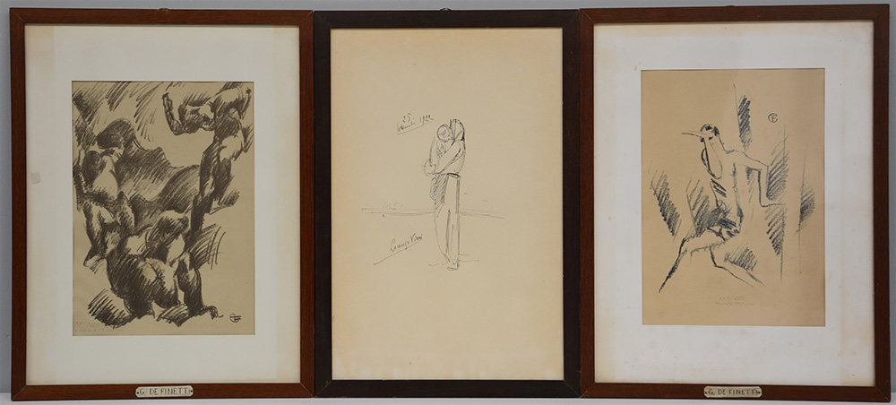 AA. VV. Lotto di tre litografie monocrome firmate Finetti e Viani di misure differenti, in cornice (difetti)