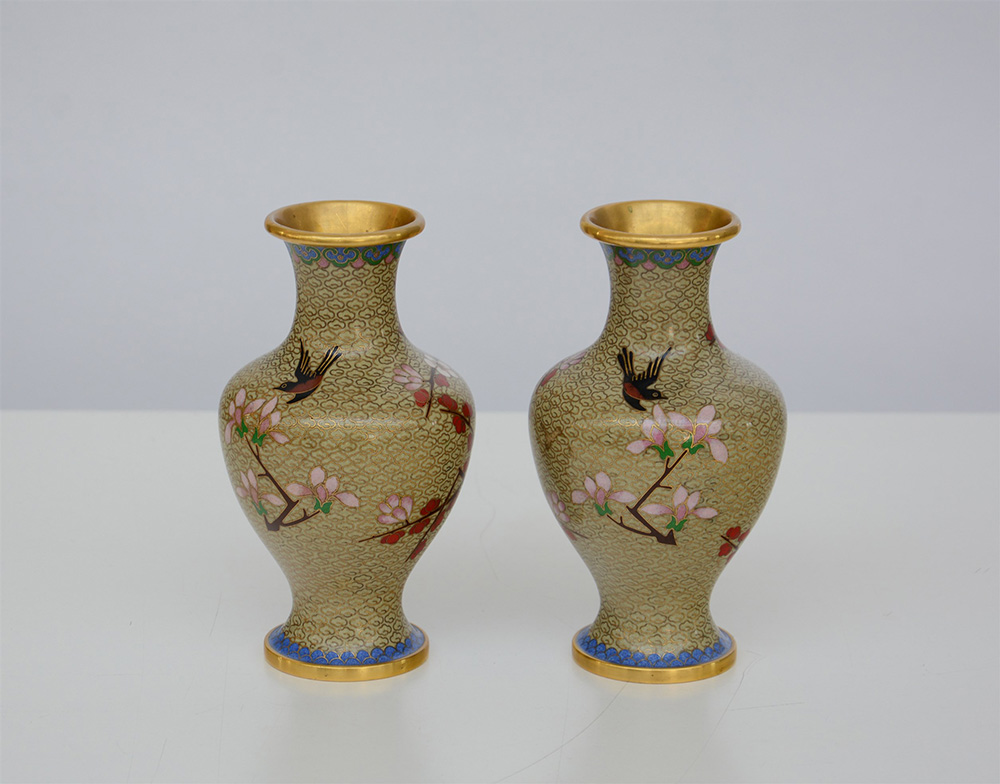 Coppia di vasi cloisonné decorati con motivi floreali su fondo giallo