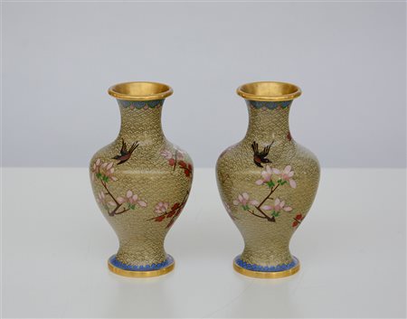 Coppia di vasi cloisonné decorati con motivi floreali su fondo...
