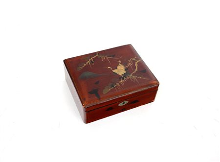 Scatola rettangolare con coperchio, laccata in rosso e decorata con gru...