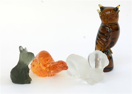 Lotto di quattro animali in vetro di varie manifatture e colori. Seconda metà secolo XX. (difetti)
