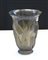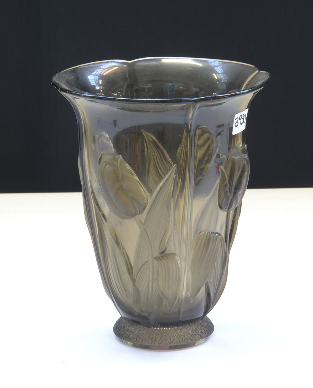 Vaso in vetro soffiato in stampo trasparente fumé con fiori. Secolo XX. (h cm 23) (lievi difetti)