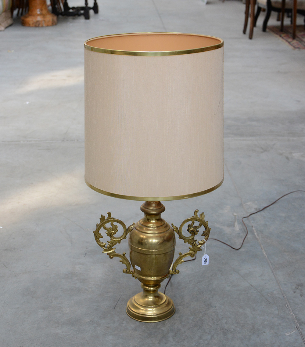 Lampada biansata in ottone tornito con anse sagomate e traforate. Paralume in...