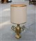 Lampada biansata in ottone tornito con anse sagomate e traforate. Paralume in stoffa