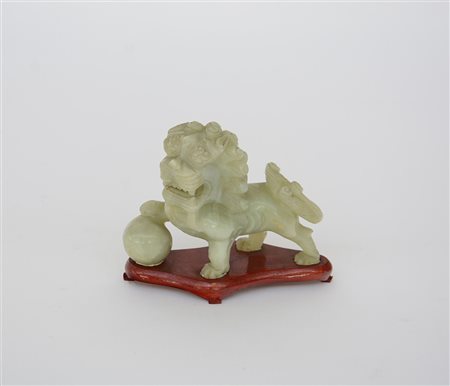 Scultura in pietra dura raffigurante leone con palla, base in legno...