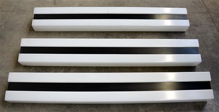 Tre lampade da plafone rettangolare. Produzione Trilux, anni '70. Metallo laccato bianco e plexiglass. (cm 127x10x17) (gravi difetti e mancanze)