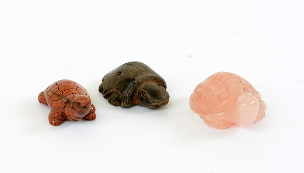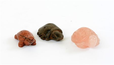 Lotto di tre piccole tartarughe rispettivamente in alabastro rosa, vetro avventurina e terracotta di epoche e manifatture diverse. (misure varie) (difetti)