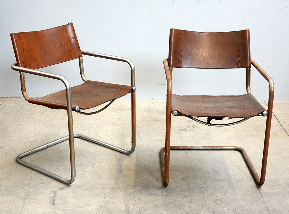 Lotto di due poltroncine. Riedizione recente dal disegno di Mart Stam del 1926/27. Anni '70. Seduta e schienale in pelle marrone e struttura in acciaio cromato. (cm 59x80x55) (difetti)