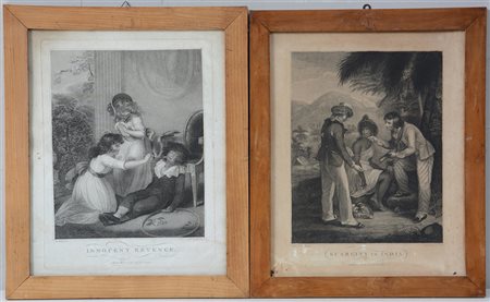 Lotto di due stampe inglesi del secolo XIX raffiguranti scene di genere (cm 48x38) in cornice