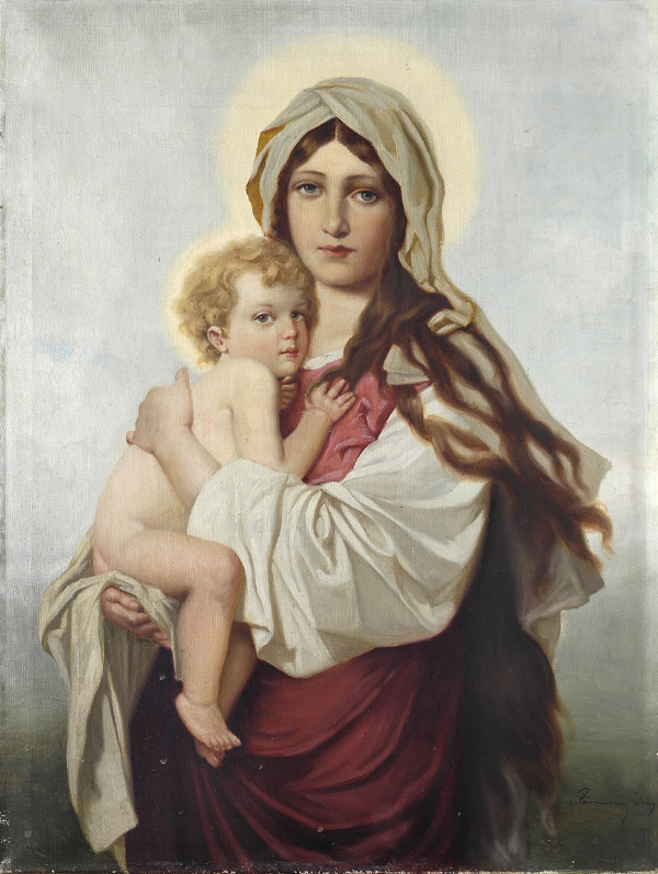 Anonimo, prima metà XX sec. Madonna con Bambino Olio su tela, cm. 80x60 Firma illeggibile in basso a destra. € 200/400