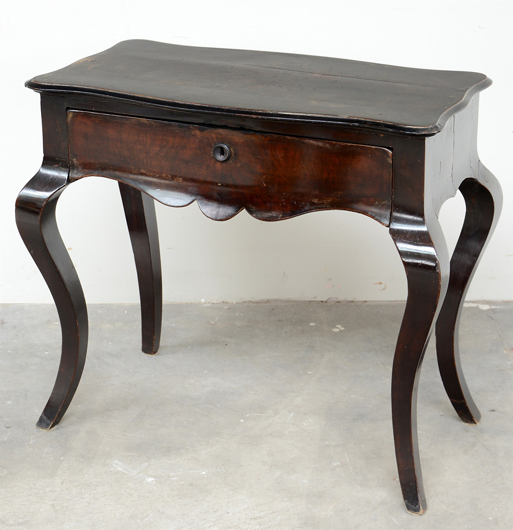 Tavolino in legno laccato con fascia e gambe mosse e piano con angoli...