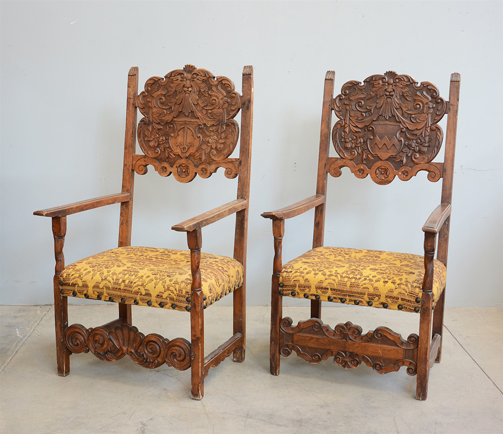 Due antiche poltrone rinascimentali con cartelle degli schienali riccamente intagliate a motivi vegetali, stemmi e mascheroni (difetti)