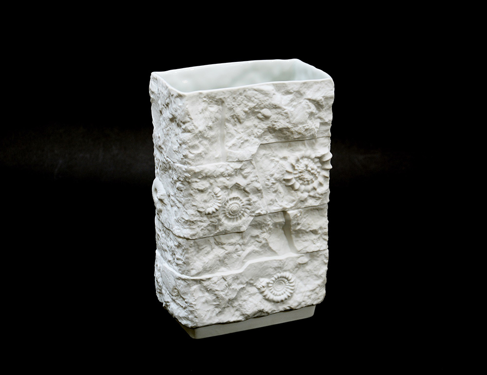 Manifattura Kaiser, vaso in porcellana a base squadrata a decoro murale con fossili marini (h cm 23)