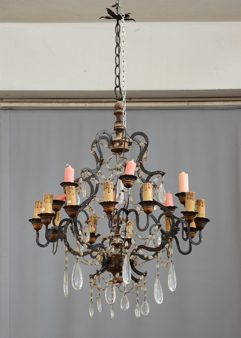 Lampadario a dodici luci con struttura in ferro battuto e legno, pendenti e gocce in vetro (h cm 95) (difetti e mancanze)