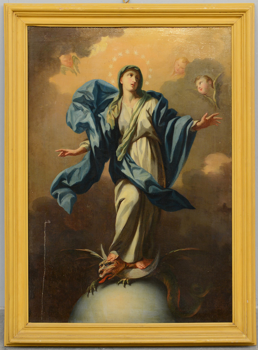 Scuola della fine del secolo XVIII "Immacolata concezione" olio su tela (cm 84x59) in cornice laccata (difetti e restauri)