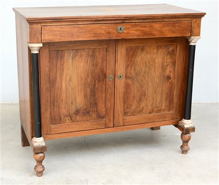 Credenza "impero" a due ante e cassetto aggettante sottopiano, decorataa con colonne laterali ebanizzate. Piedi anteriori torniti a plinto (cm 116x100x57) (difetti)