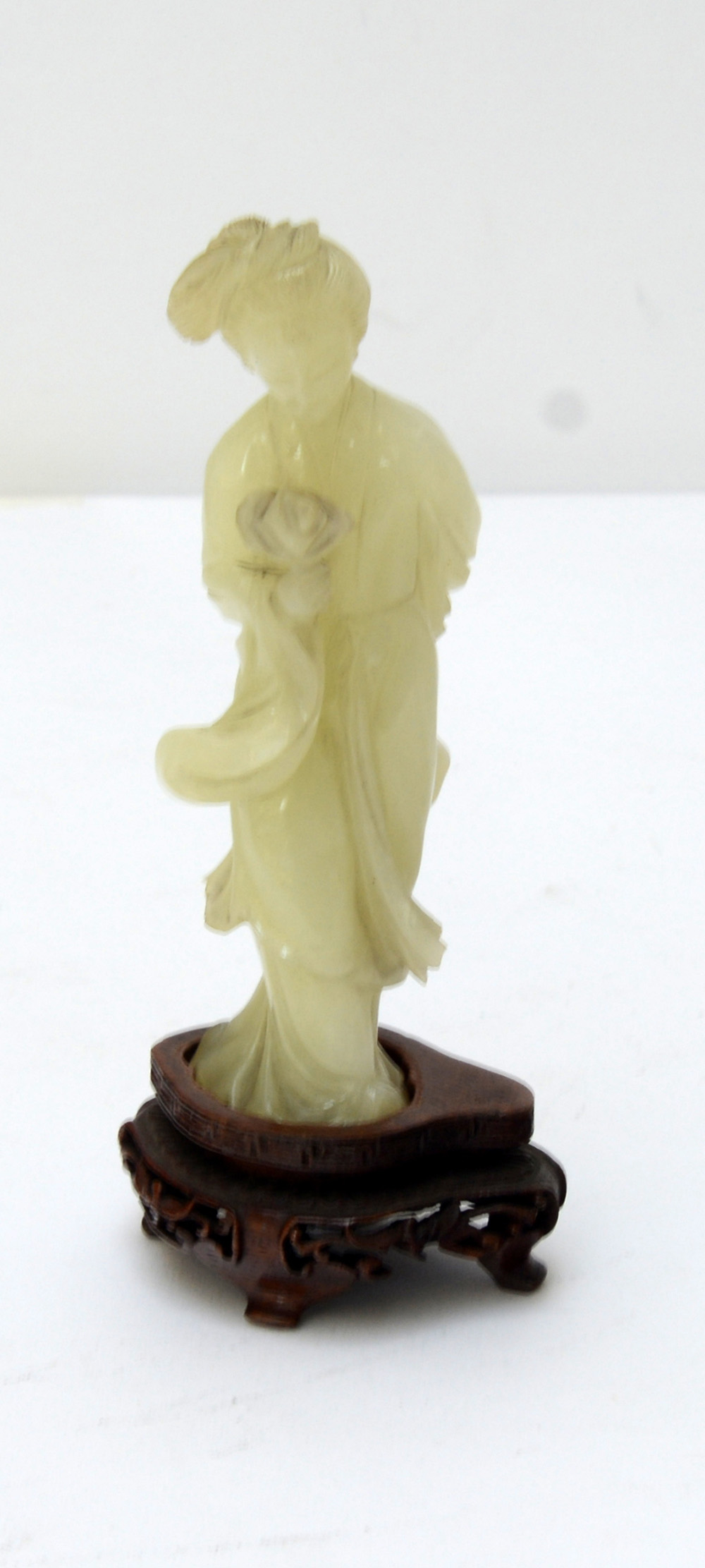 Scultura in pietra dura raffigurante donna dalle lunghe vesti, base in legno (difetti, mancanze)