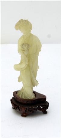 Scultura in pietra dura raffigurante donna dalle lunghe vesti, base in legno...