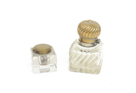 Lotto di due calamai in cristallo con tappi in metallo (h max cm 14) (difetti)