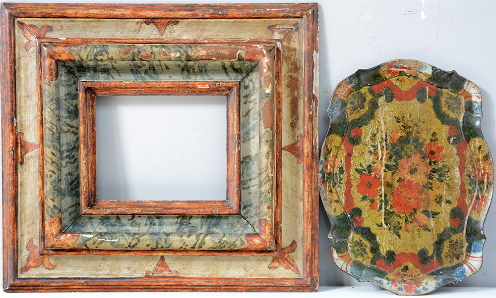 Lotto composto da una cornice in legno laccato e dipinto a finto marmo (cm 34,5x29,5) ed un pannello decorativo dipinto a fiori (difetti)