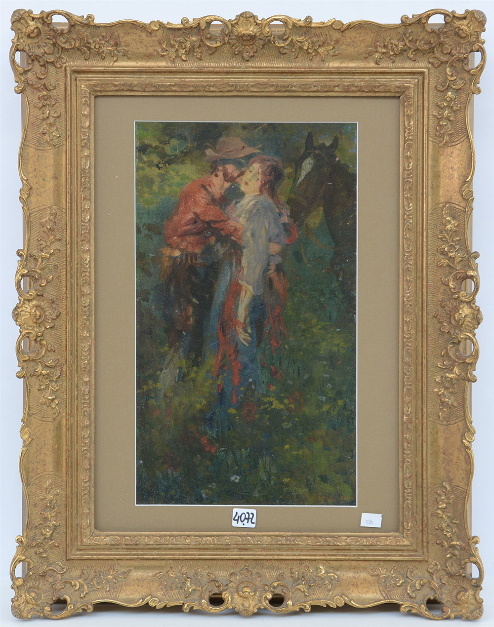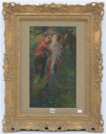 Firma indecifrata "Il bacio" olio su cartone (cm 42.5x23) Firmato in basso a destra. In cornice