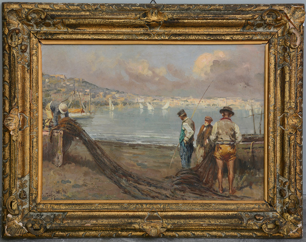 "Pescatori" olio su tela (cm 48x67,5) firmato in basso a sinistra. In cornice (difetti alla cornice)