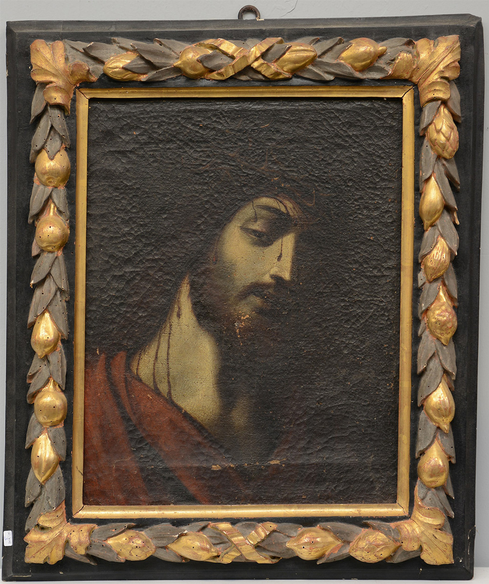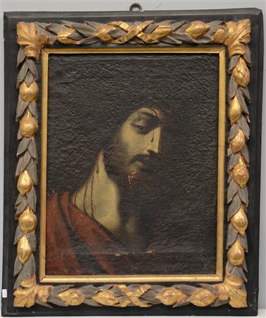 Ignoto del secolo XVII "Ecce Homo" olio su tela (cm 48x38). In cornice antica in legno dipinto (difetti)
