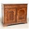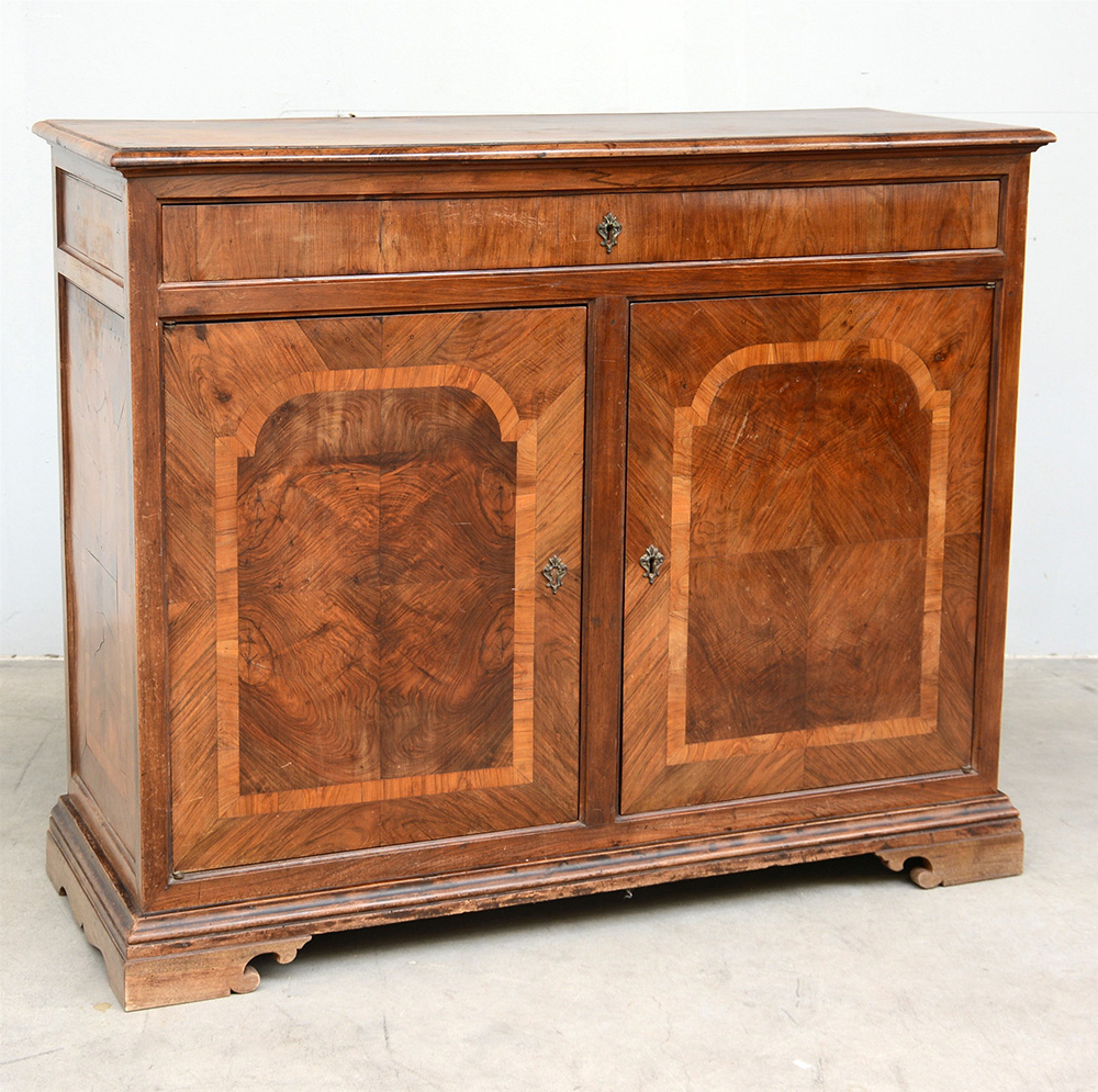 Credenza a due ante lastronate in radica intarsiate con filettatura architettonica, cassetto sottopiano. Secolo XIX (cm 129x107x49) (difetti)
