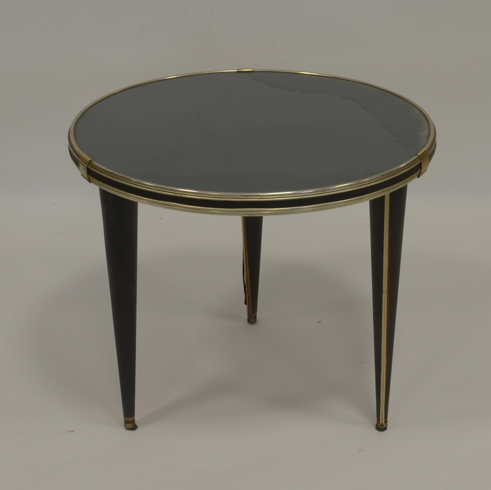 Tavolino da salotto tondo a tre gambe coniche rivestite in similpelle, piano in vetro. Italia, anni 50 (d cm 60; h cm 50)