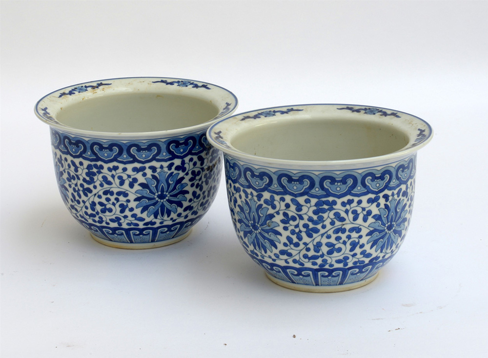 Manifattura di Cina. Coppia di vasi portafiori in porcellana decorati in blu su fondo bianco con fiori di loto (lievi difetti)