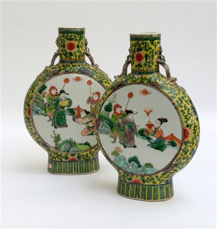 Coppia di vasi moonflask in porcellana Famiglia Verde su fondo giallo, con anse a guisa di creature fantastiche decorati con figure (difetti)