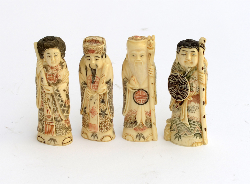 Lotto composto da quattro sculture in osso raffiguranti immortali taoisti (difetti)
