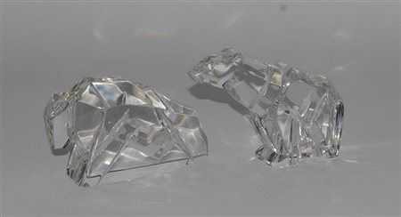 Lotto di due sculture in cristallo raffiguranti orsi. Italia, seconda metà secolo XX. Firmate all'acido sotto la base. (h max cm 11)