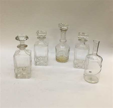Lotto composto da cinque bottiglie in vetro di cui quattro con tappoo, misure differenti (difetti)
