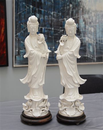 Due Guanyin in porcellana Blanc-de-Chine, basi in legno (difetti)