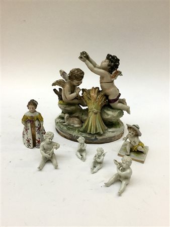 Manifatture diverse, lotto di sei piccole sculture in porcellana e un gruppo plastico con cherubini, misure differenti (difetti e restauri)