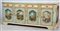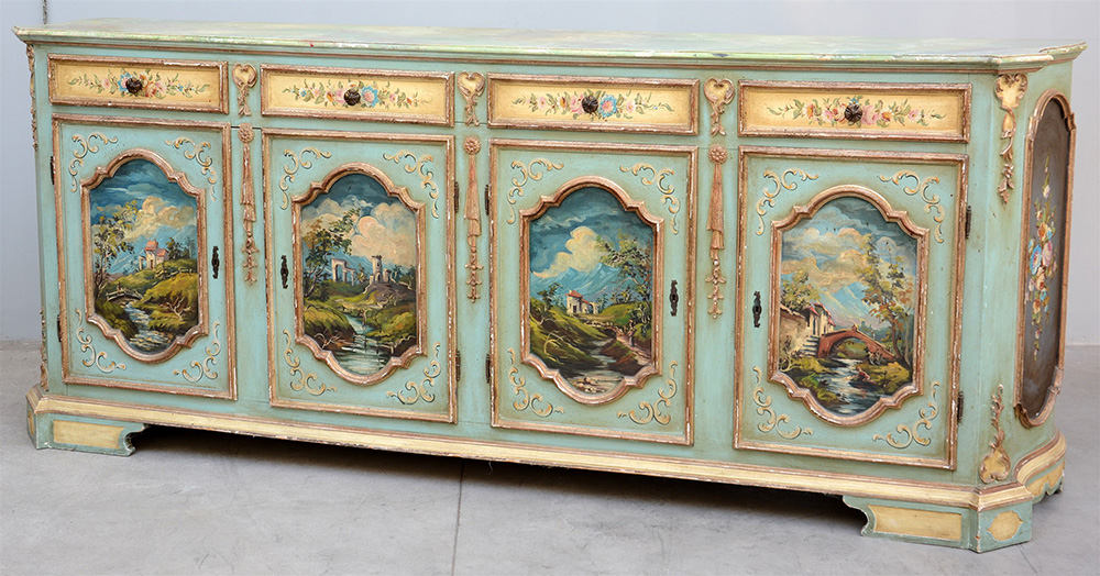 Credenza laccata a fondo verde a quattro cassetti dipinti in policromia a fiori e quattro ante riquadrate dipinte al centro a paesaggi policromi. Decorata da fregi in legno dorato, piano laccato a finto marmo (cm 266x108x59) (difetti)