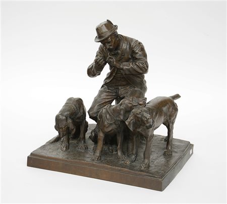 Ignoto, "Figura di uomo con pipa e cani da caccia" gruppo in bronzo (cm 35x40x27) (difetti e mancanze)